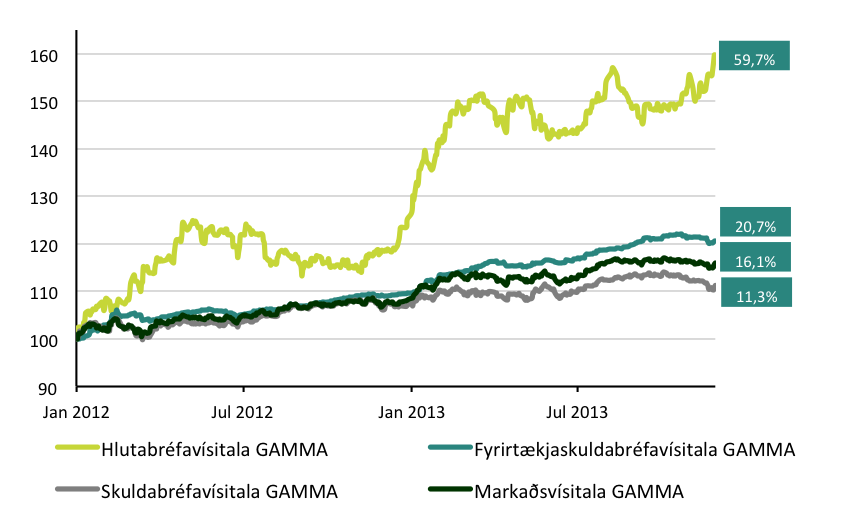 Markaðsvísitalan er bakreiknuð aftur til ársbyrjunar 2012 og hefur hún þá gildið 100; má sjá þróun hennar í meðfylgjandi mynd í samanburði við aðrar vísitölur GAMMA til nóvemberloka 2013. Ávöxtun Markaðsvísitölu GAMMA yfir tímabilið hefur verið 16,1%, sem gerir um 8,1% á ársgrundvelli. Samanburður við aðrar vísitölur GAMMA sýnir hvernig Skuldabréfavísitala GAMMA, sem inniheldur íbúða- og ríkisbréf, togar niður ávöxtun Markaðsvísitölunnar á meðan hlutabréf og fyrirtækjaskuldabréf sýna talsvert betri árangur. Beinn samanburður er þó ekki mögulegur án þess að taka til greina að áhættuálag (eins og skuldara- og seljanleikaálag) þessara eignaflokka er talsvert hærra heldur en á ríkistryggðum skuldabréfum. Vísitölur GAMMA með upphafsgildi 100 í byrjun árs 2012